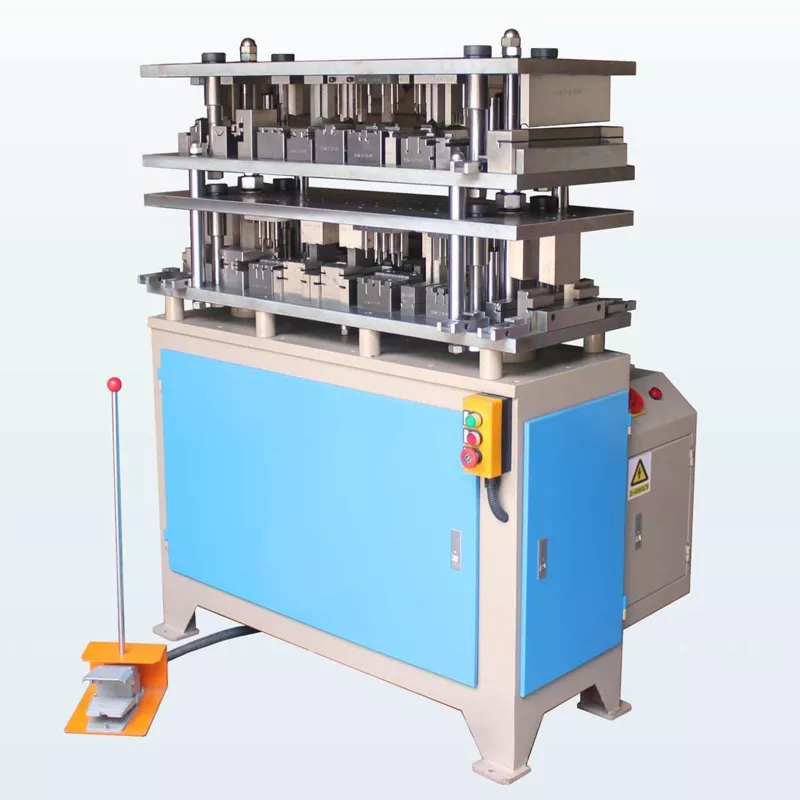 It is mainly used for stamping the holes, slots and notches of various aluminum alloy doors and Windows and curtain wall profiles. Combined design, can be a series of aluminum profile mold assembly to a mold machine, to achieve a series of machines, a series of profiles, a machine to finish the machine; The transmission mode adopts the hydraulic system as the transmission, and the hydraulic cylinder drives the tension rod of the mold. The tension rod adopts two guide pillars as the guide, and a parallel shaft is added in the process of the hydraulic cylinder driving the two guide pillars. The mold structure is matched with a precision guide column. The guide column is treated with high temperature and fine grinding to make the transmission parts of the mold stable and reduce wear, so as to ensure the long-term coordination accuracy between the upper and lower molds during work, so as to make the molds more synchronous and parallel in the work. In this way, it completely eliminates the phenomenon of mold shaking, stuck material, broken knife and so on, which often occur on similar models in the past due to the imbalance of mold or punch load position and uneven force. It has a larger load stroke and a larger load capacity, good stability, high efficiency, low noise, no pollution, high precision, easy to operate, fast, safe and reliable!